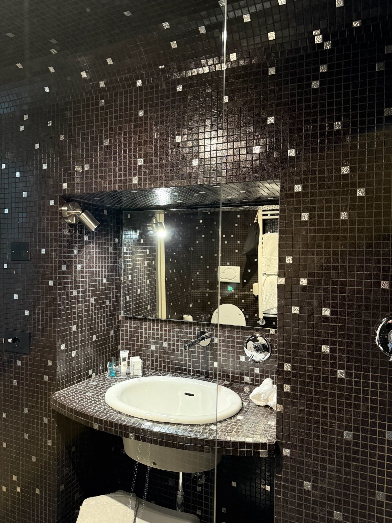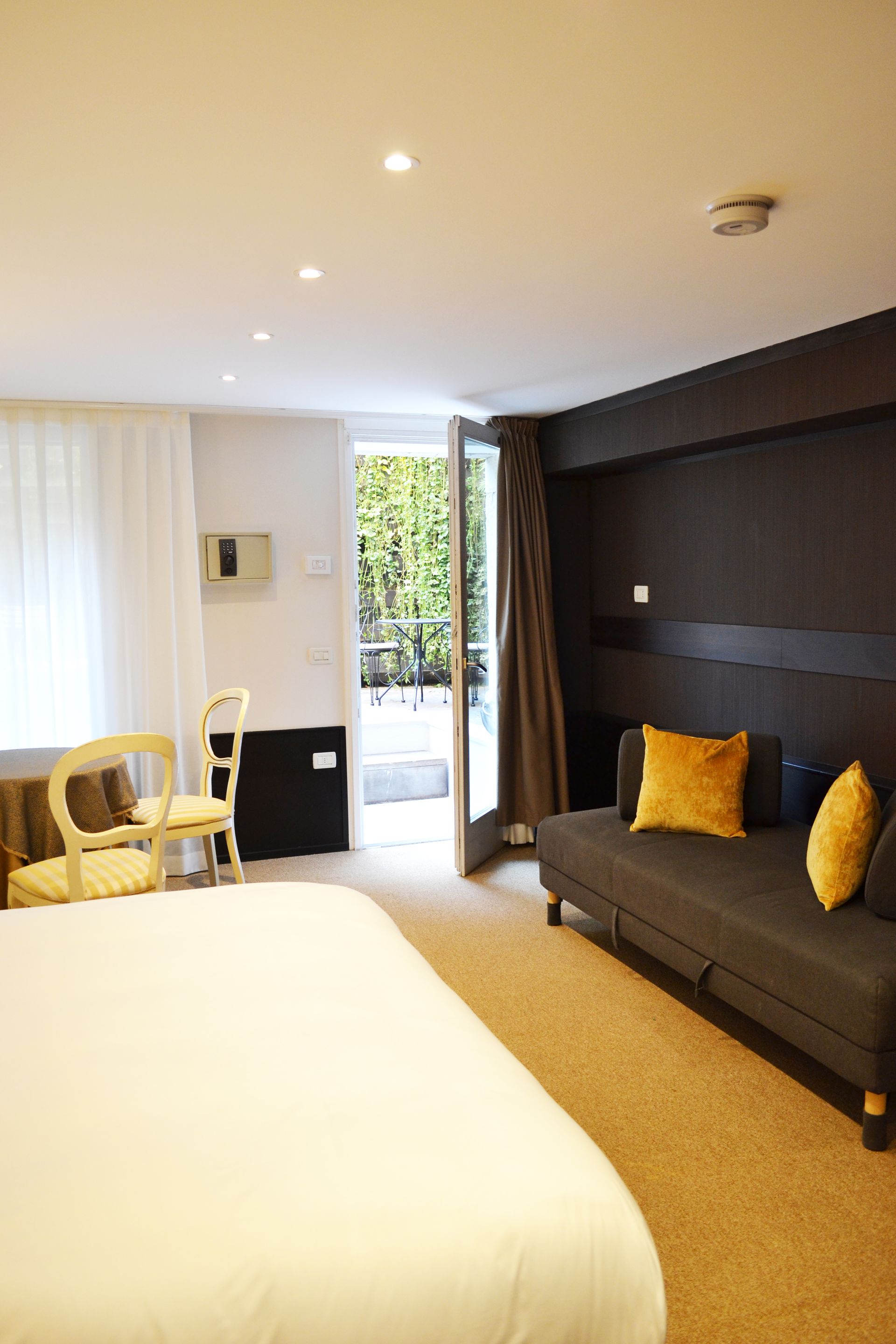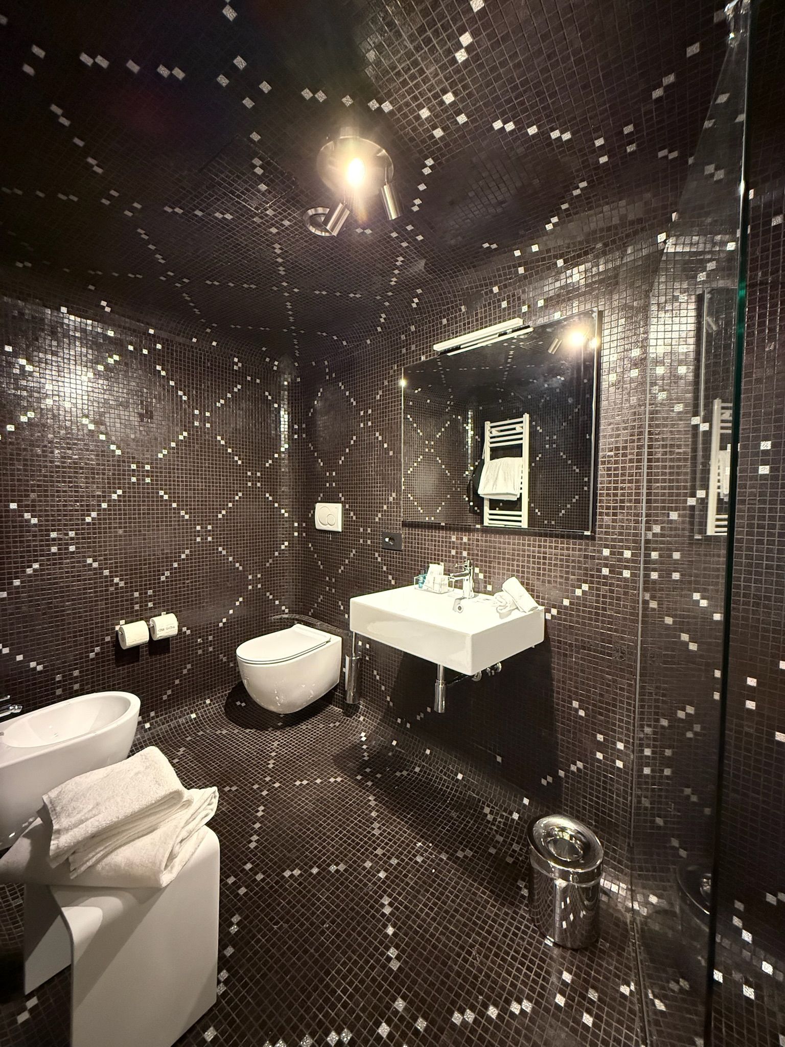 28 sqm room with exclusive private garden and comfortable sofa bed. Refined dark brown and white gold Bisazza mosaic tiles embellish the bathroom.