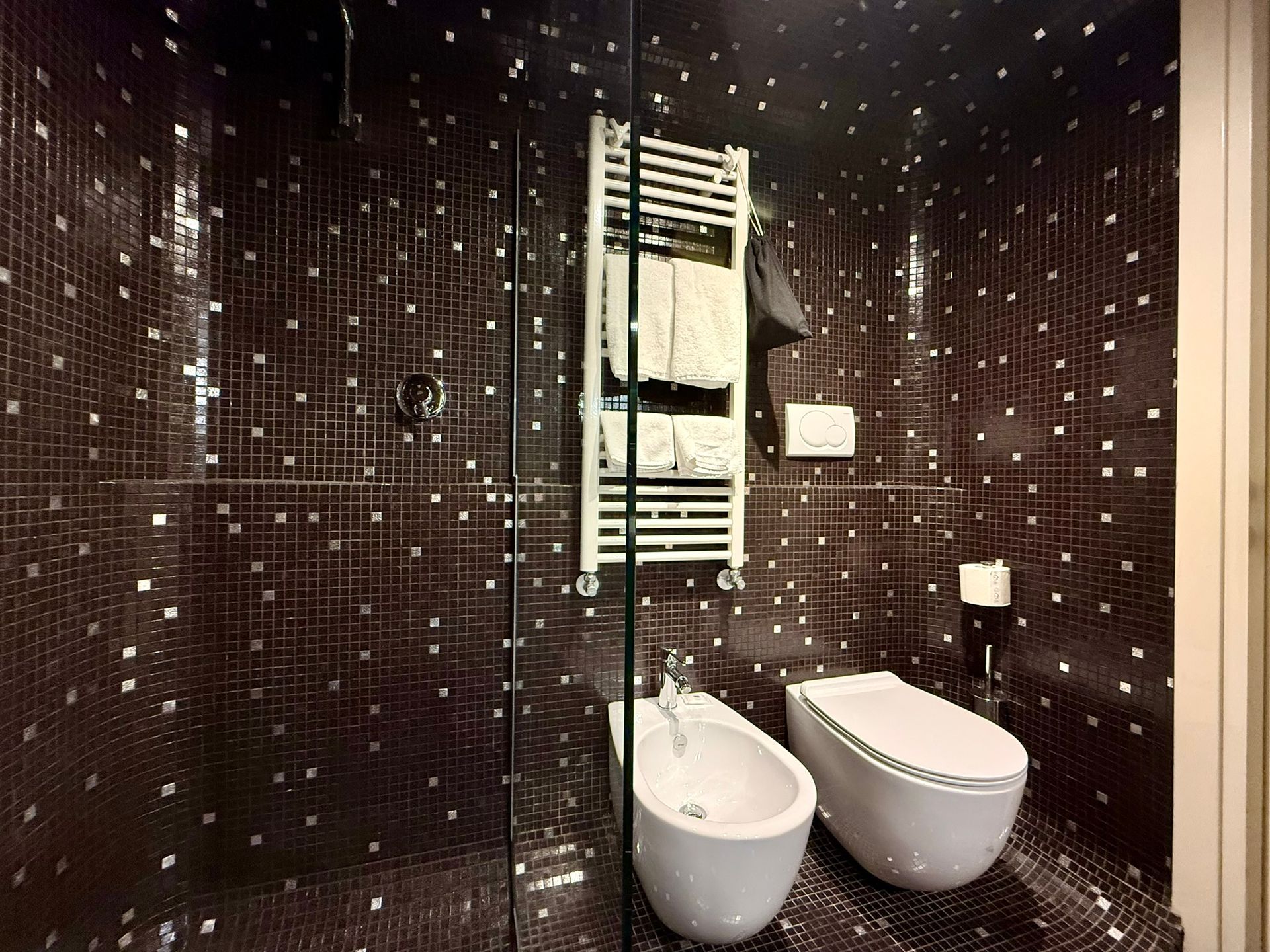 The interiors, dominated by the shimmer of white gold and dark brown Bisazza mosaics, create a warm and sophisticated atmosphere.