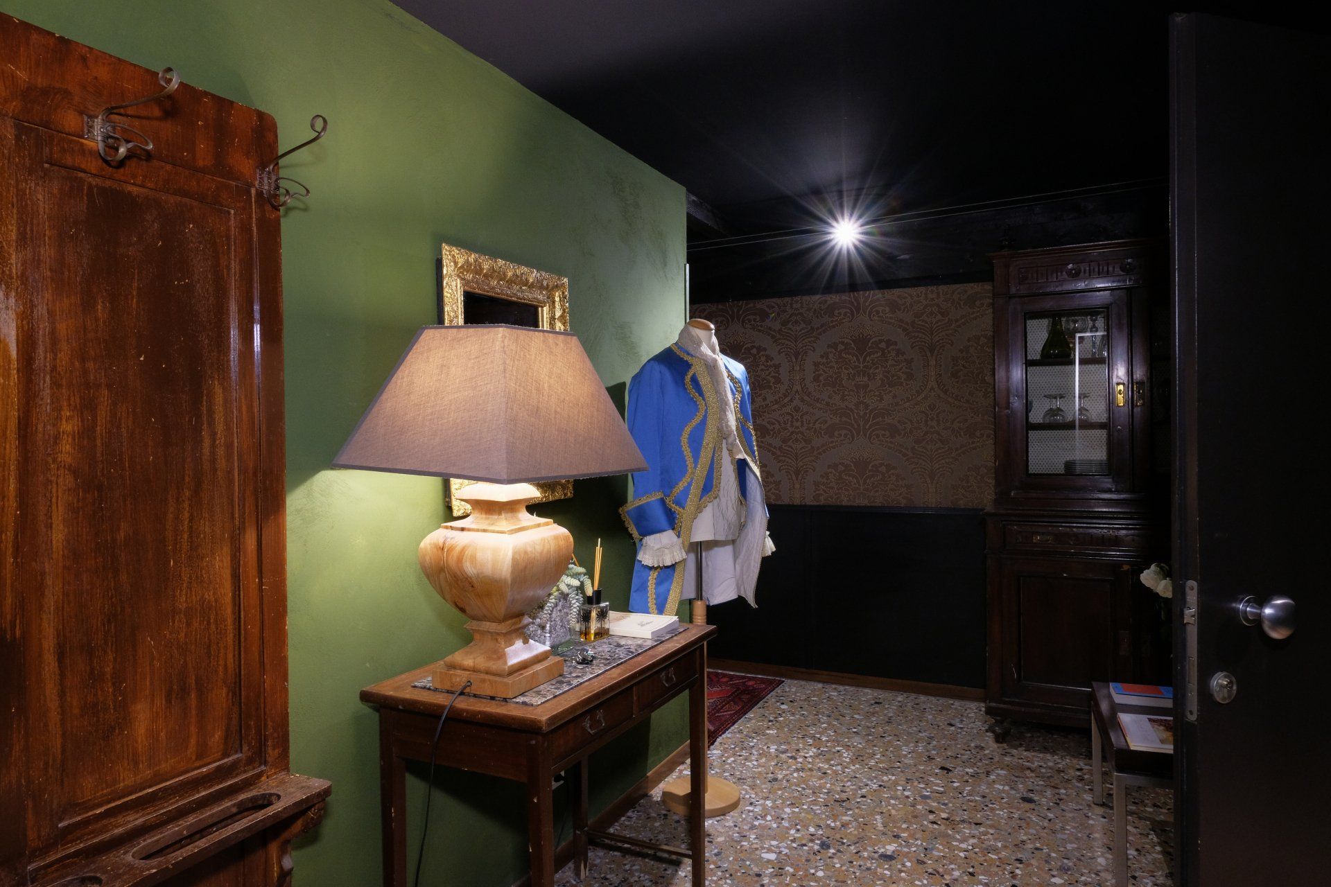 Camera di 20 mq con vista sulla tipica calle. Le pareti in stucco veneziano verde e il lampadario in vetro di Murano degli anni ’40 le conferiscono un fascino unico.